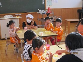 11月18日(火)にもも組が食育でジャムサンド作りを行いました。自分でイチゴジャムを塗り手作りサンドイッチを完成させました。いつもとは違うおやつの時間となり、大きな口で頬張る姿が見られ、嬉しそうな笑顔があふれていました。